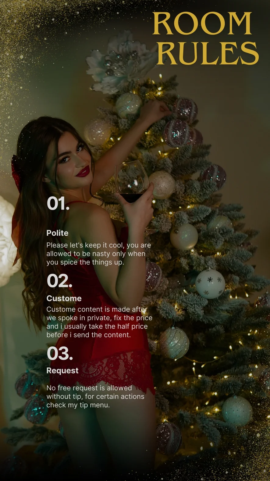 Erotikus tánc, Villantás, Fenekelés, Ahegao, Maszturbálás, Tevepata, Kutyapóz, Spriccelés, Félmeztelen, Dildó vagy vibrátor, Mocskos beszéd, Sztriptíz, Olajozás, Orgazmus, Szerepjáték, Szájpecek, Ujjazás, Megalázás, Nejlon, Masszás, Szopás, Lábfétis, Lábmunka, Mély torok, Arcra ülés, Farok értékelés, Cam2Cam, 69-es pozíció, Kézimunka, Szexjátékok, Twerk, Cici baszós, Lovaglás, Felszarvazott, Úrnők, Kiverési utasítások, Magassarkú